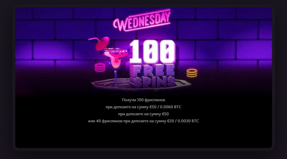 Первый депозит 100% до 8800 рублей или 1,5 BTC плюс 100 бесплатных вращений в любом автомате от провайдера BGaming,в Play'nGo:Moon Princess или Book of Dead,в IGTech: Wolf Treasure или NoLimit City: Book of Shadows
