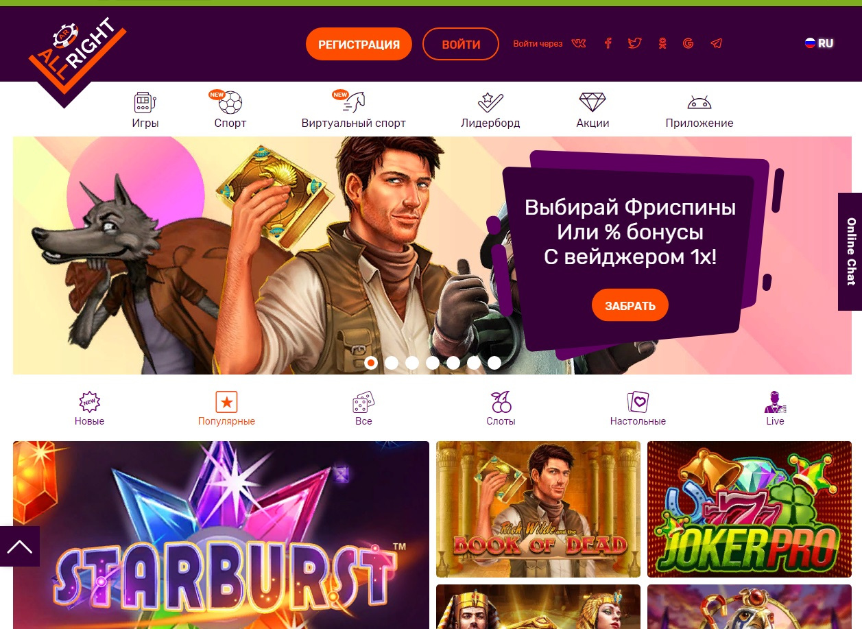 Для новых игроков казино AllRight предлагает бездепозитный бонус 40 бесплатных вращений за регистрацию в игровом автомате Wild Wild West и крутые бонусы за пополнение счёта.