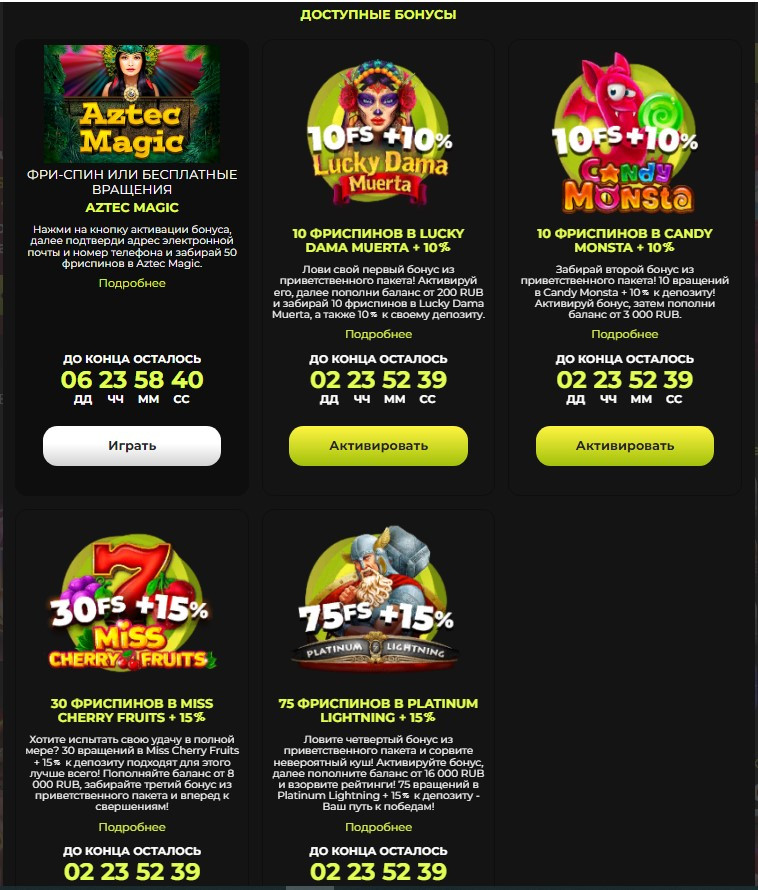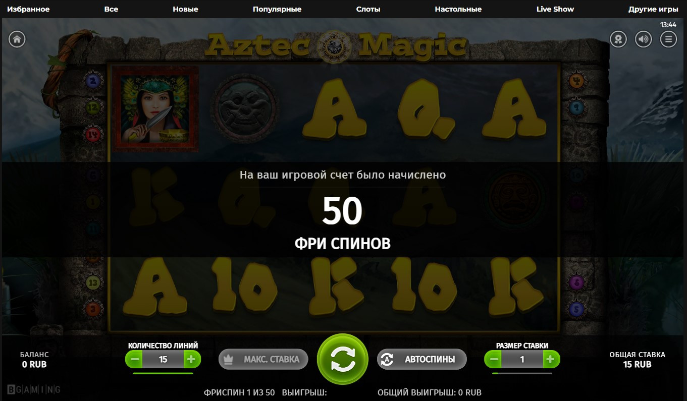 Сразу после регистрации и выполнения ряда действий Вы получите 50 бесплатных вращений в игровом автомате Aztec Magic по ставке 15 рублей за спин.