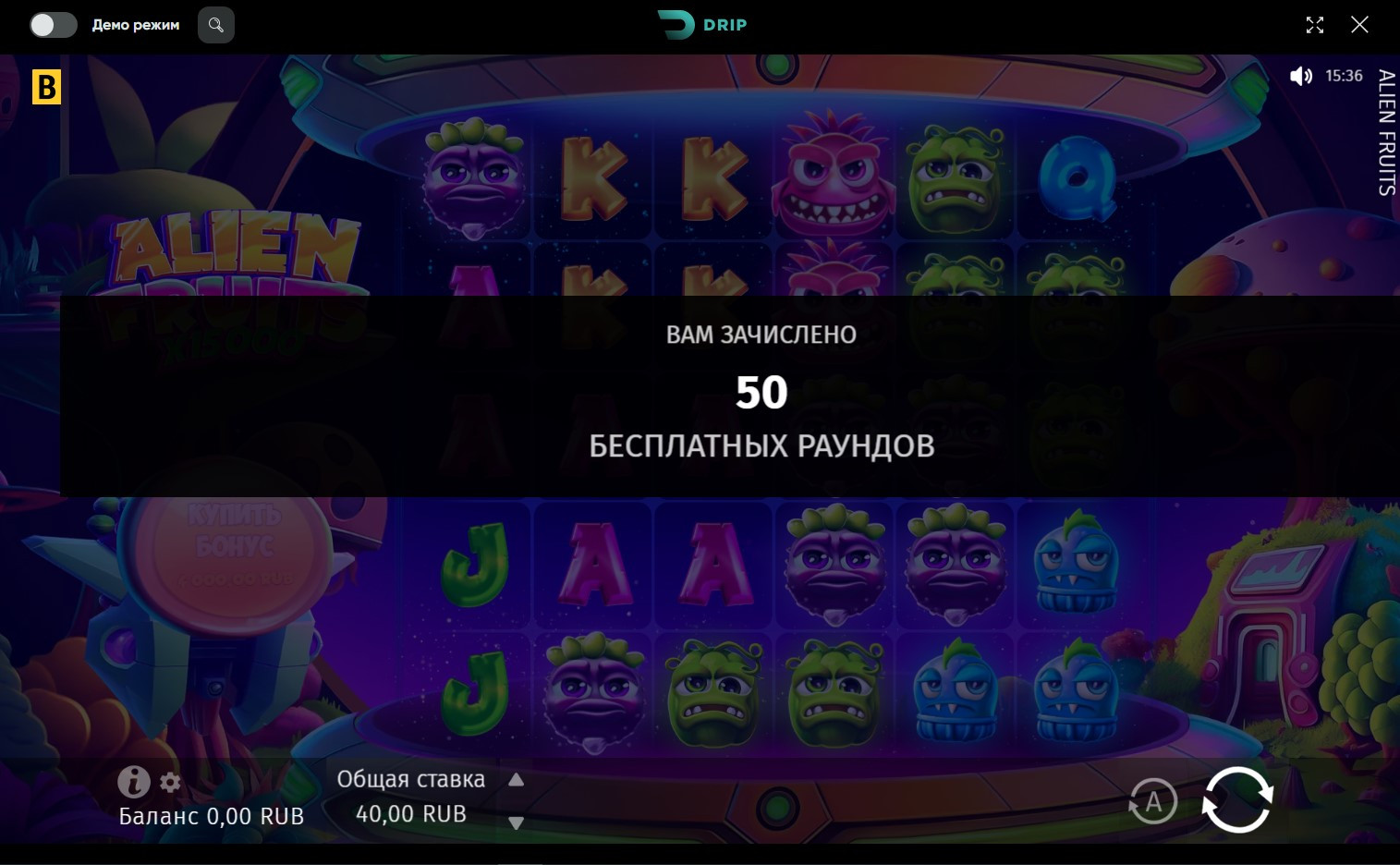 Нажмите на свой баланс и запустите игру Alien Fruits .