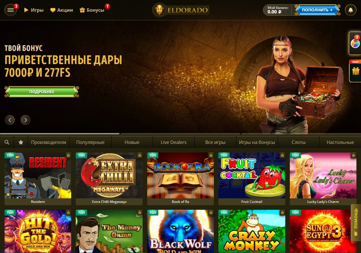 Eldorado Casino подойдёт для тех игроков,которые любили играть в игровые автоматы в игровых клубах до их запрета.Здесь представлены почти все игры этих клубов и каждый посетитель найдёт интересующий его слот.К сожалению казино не имеет лицензии и соответственно все игровые автоматы нелицензионные.Казино регулярно проводит лотереи и турниры,а также дарит много подарков за уровни.За установку телеграм-бота казино подарит 33 фриспина без депозита.