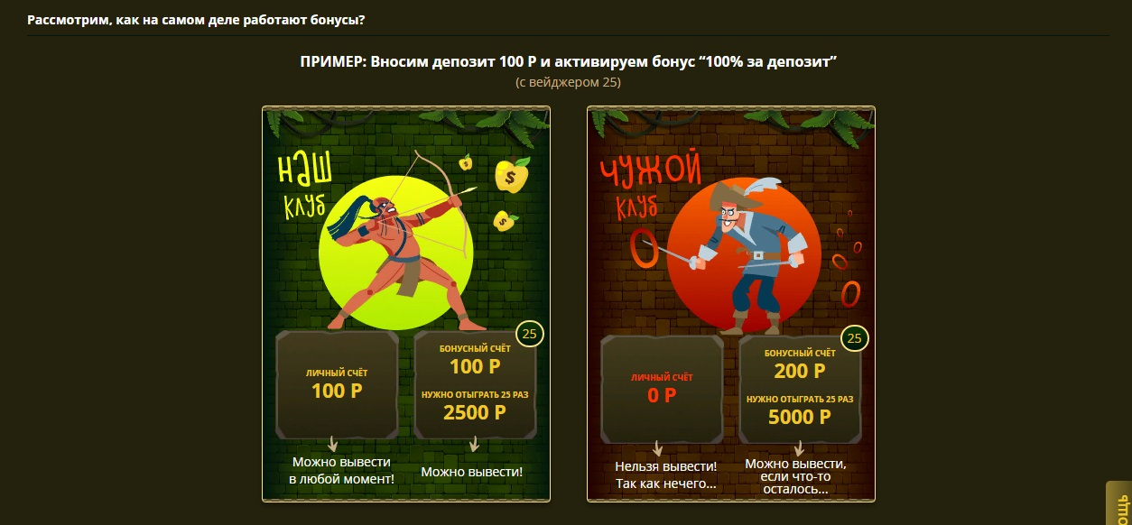 Бонусы за депозиты от 100 рублей с вейджером Х25 только на бонус и возможностью вывода личных средств в любой момент