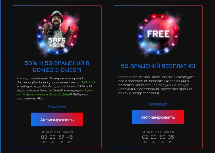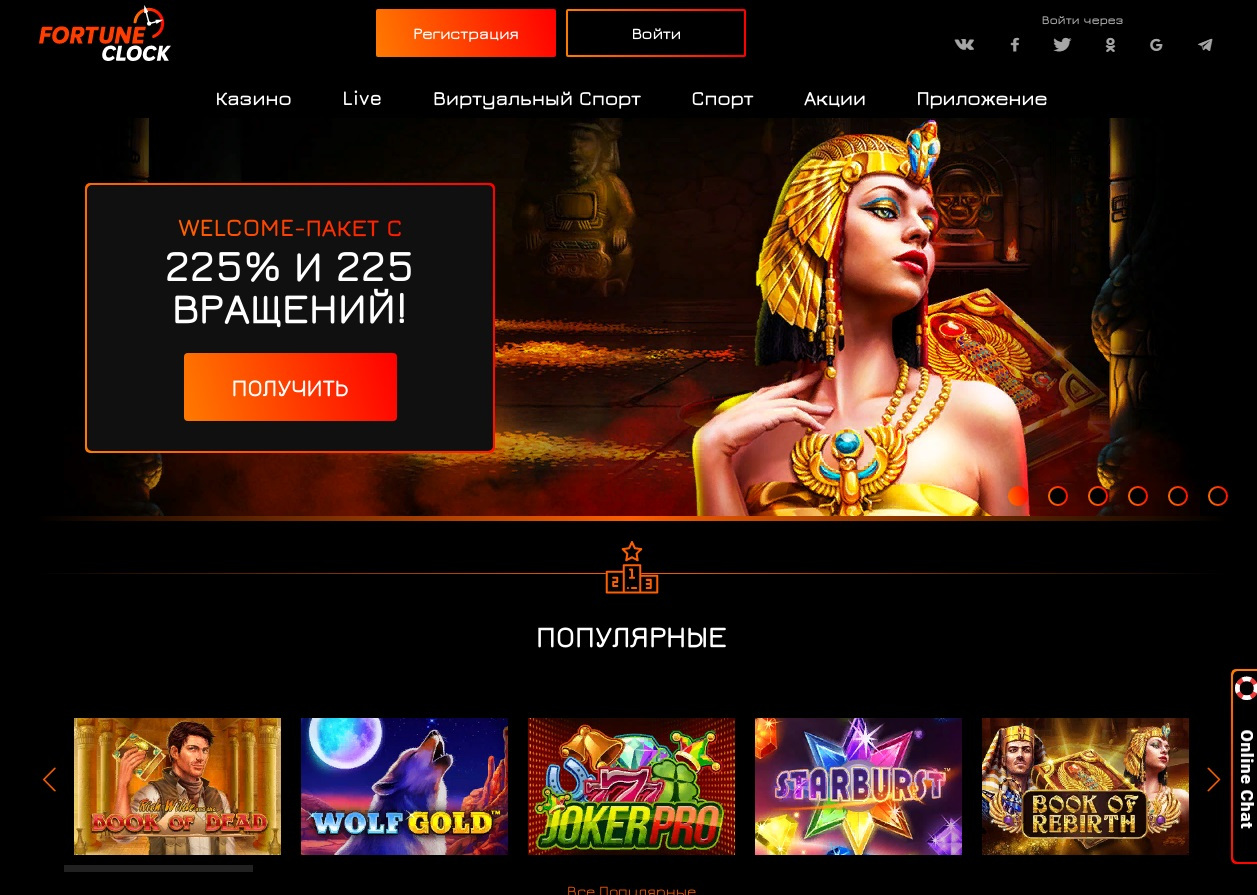 Fortune Clock Casino для игры предлагает 54 самых популярных провайдеров и раздел "СПОРТ" для любителей тотализатора.А для наших игроков казино дарит бездепозитный бонус за регистрацию 50 бесплатных вращений в самом популярном автомате Starburst