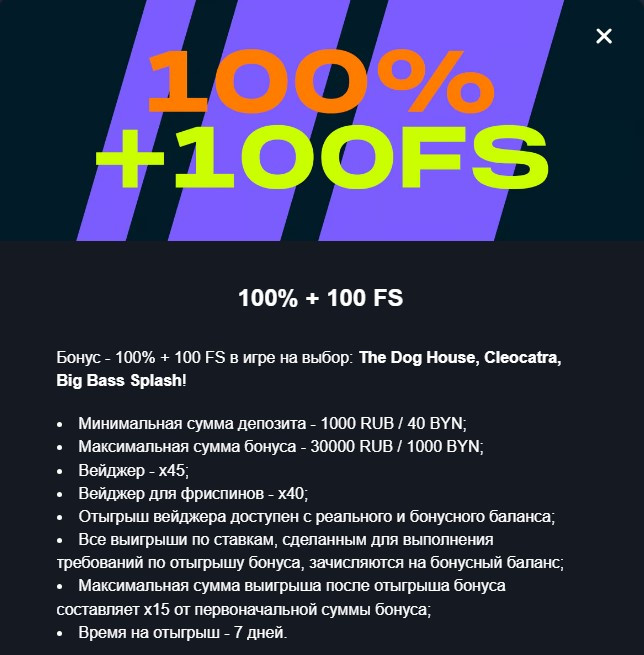 Бонус - 100% + 100 FS в игре на выбор: The Dog House, Cleocatra, Big Bass Splash!