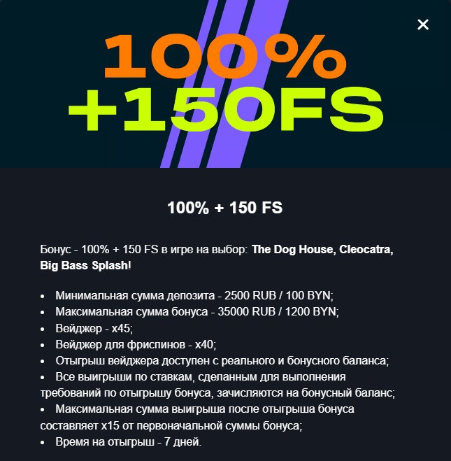 Бонус - 100% + 150 FS в игре на выбор: The Dog House, Cleocatra, Big Bass Splash!