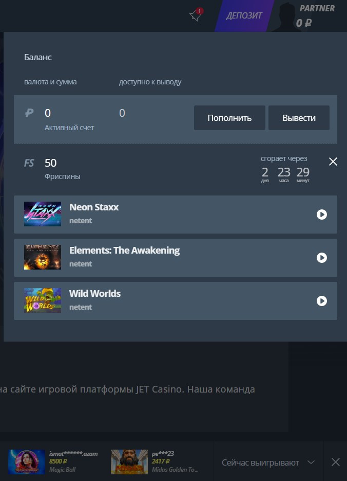 Для игроков нашего сайта казино предоставляет условно-бесплатный бонус в виде 50 бесплатных вращений в игровом автомате (для счетов в валюте RUB/KZT) - Neon Staxx , Wild Worlds или Elements:The Awakening.