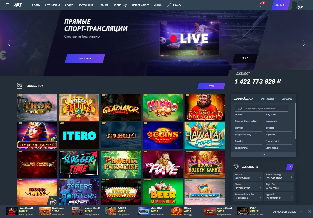 Следуйте за инстинктом азарта и откройте для себя бескрайний мир лицензионных игр и крупных выигрышей на сайте игровой платформы JET Casino. Наша команда станет для вас надежным проводником в сфере онлайн-казино и ставок на спорт.