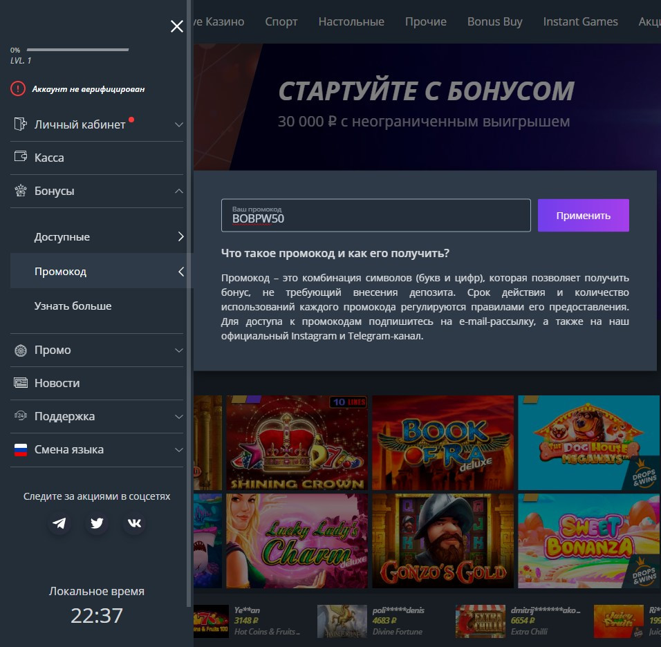 Войдите в раздел "БОНУСЫ",введите код BOBPW50 и активируйте его.