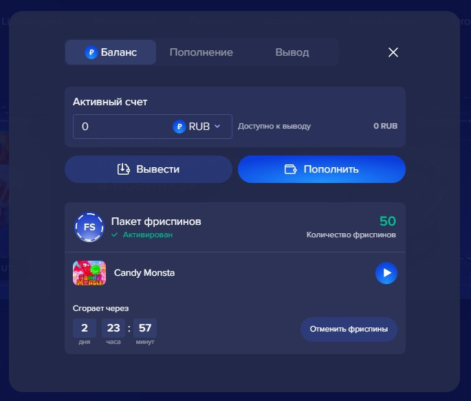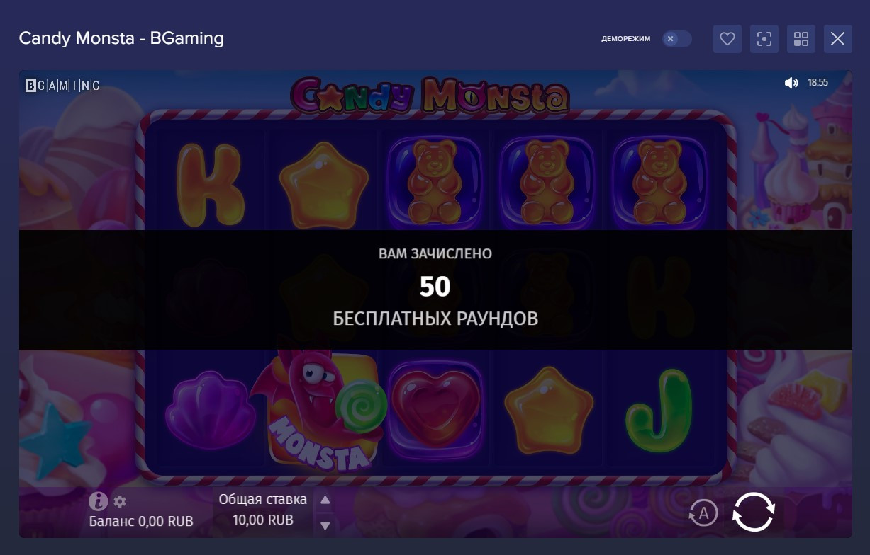 Для игроков нашего сайта казино предоставляет условно-бесплатный бонус в виде 50 бесплатных вращений в игровом автомате CANDY MONSTA (BGaming)