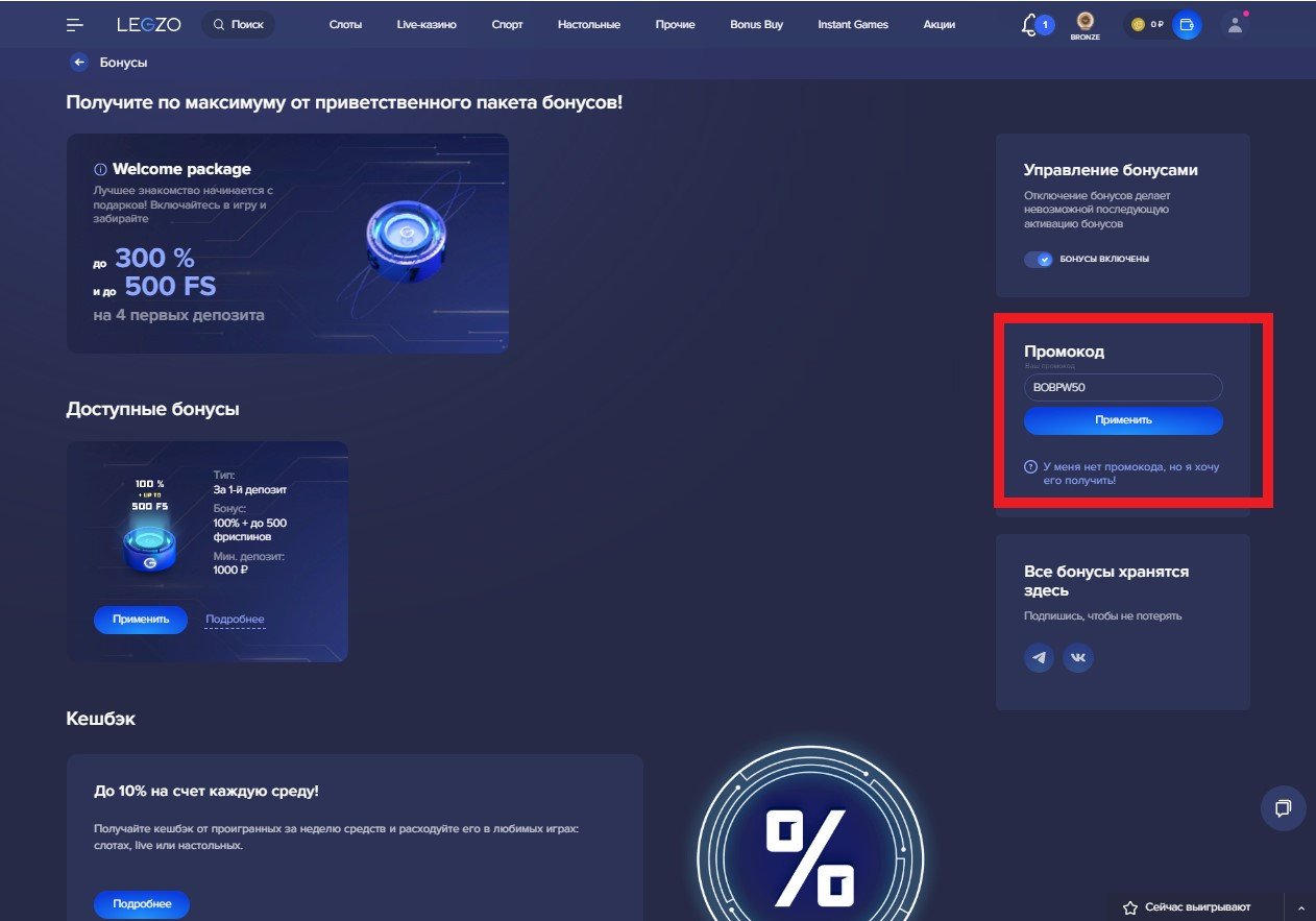 Войдите в раздел "БОНУСЫ",введите код BOBPW50 и активируйте его.