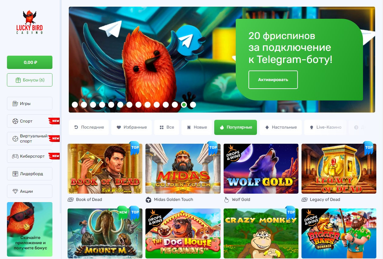 Lucky Bird Casino для игры предлагает 128 самых популярных провайдеров и раздел "СПОРТ" для любителей тотализатора.А для наших игроков казино дарит скромный подарок-бездепозитный бонус за регистрацию 50 бесплатных вращений в игровом автомате MISS CHERRY FRUITS