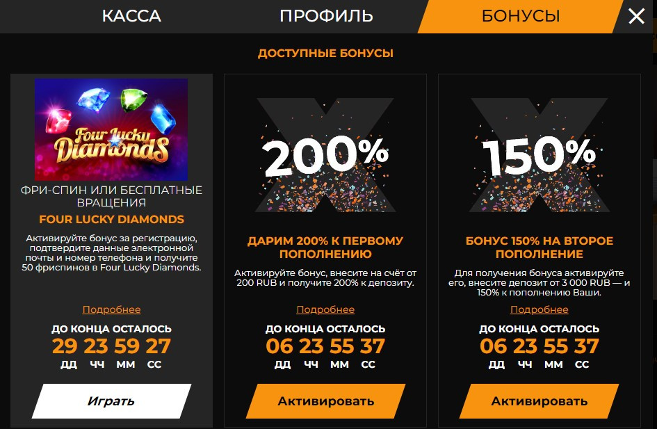 За регистрацию в казино MisterX новым игрокам доступен бездепозитный бонус-50 бесплатных вращений в игровом автомате Four Lucky Diamonds.Также вы можете получить 20 фриспинов в слоте Deep Sea ,если подключите ваш аккаунт к Telegram-боту.