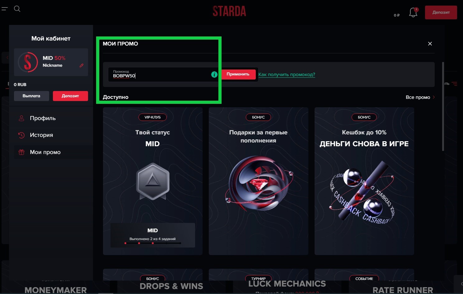 Войдите во вкладку "Мой кабинет-мои промо",введите код BOBPW50 и активируйте его.