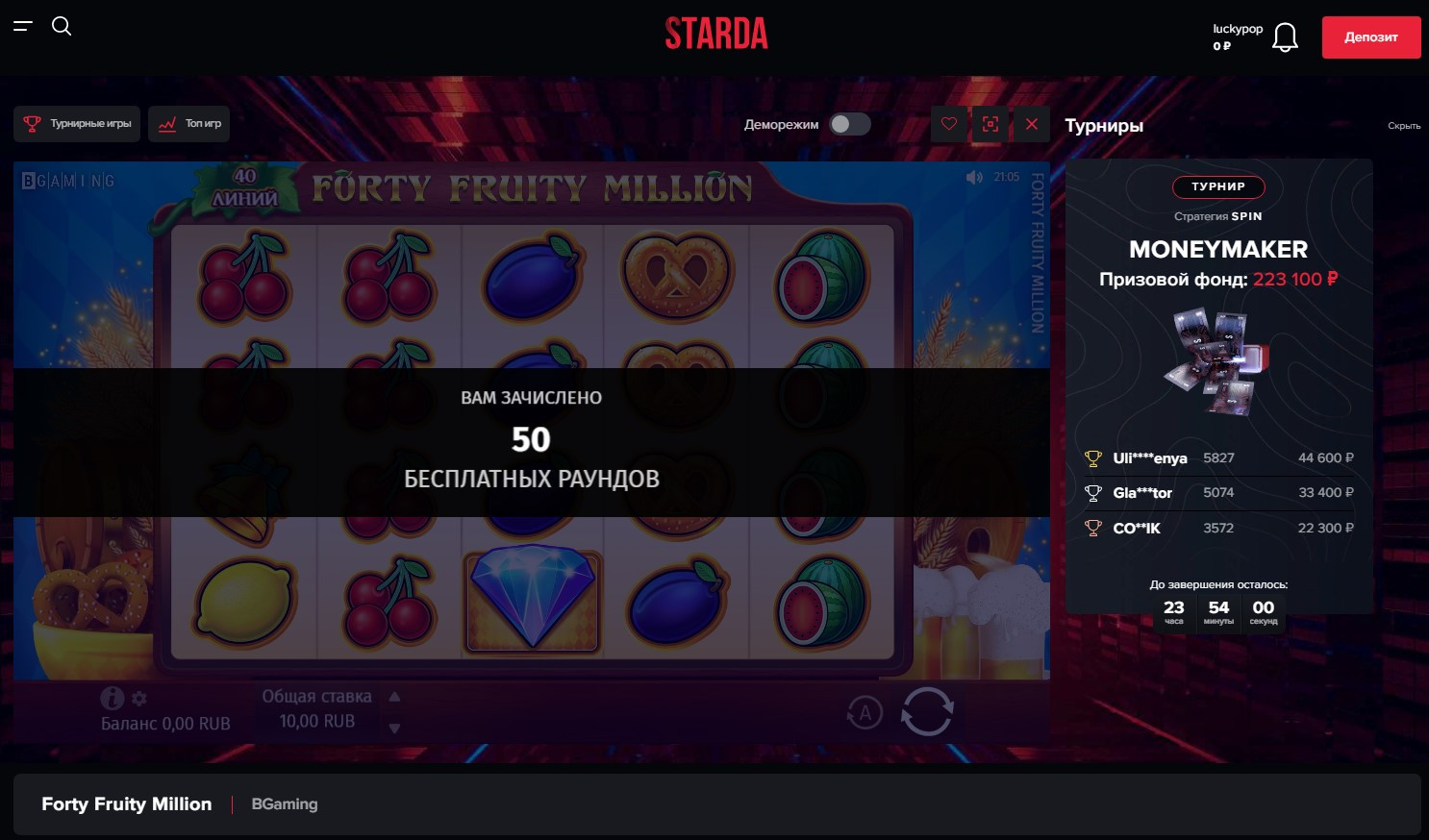 Запустите игру FORTY FRUITY MILLION и там будут 50 фриспинов.