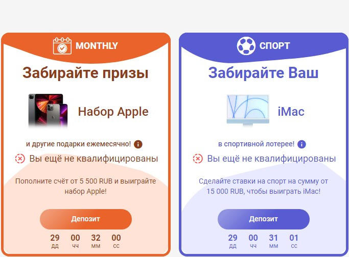 4.Сделайте ставок на сумму от 15000 рублей в месяц и участвуйте в розыгрыше iMac,GoPro HERO,AirPods Pro,мяч Лиги Чемпионов или фитнес-трекер от компании Xiaomi. Призы можно обменять на деньги без условий.Розыгрыш проводится раз в месяц.