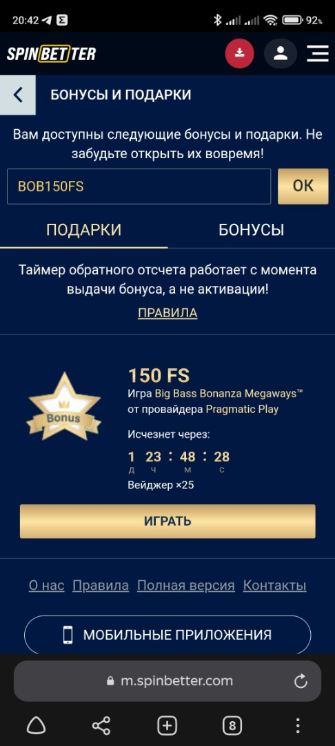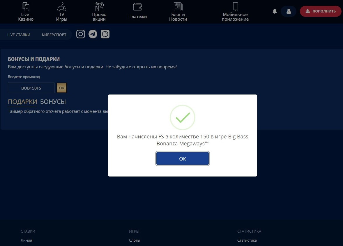 Войдите во вкладку "бонусы и подарки" и активируйте код BOB150FS