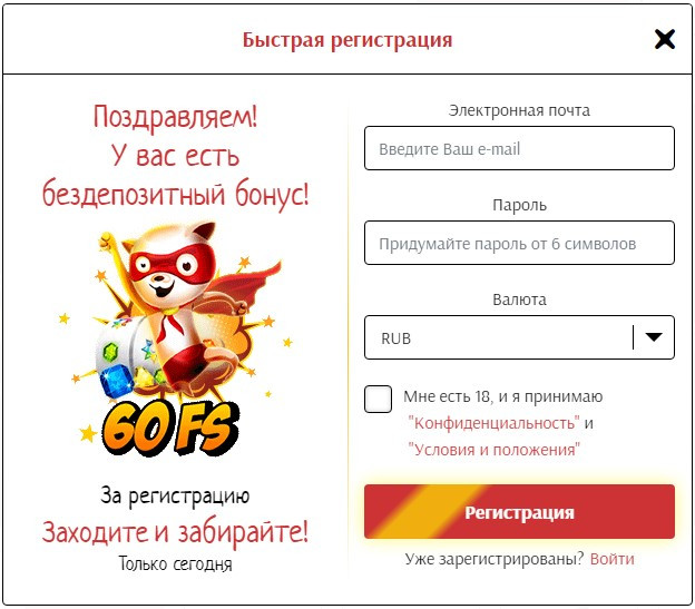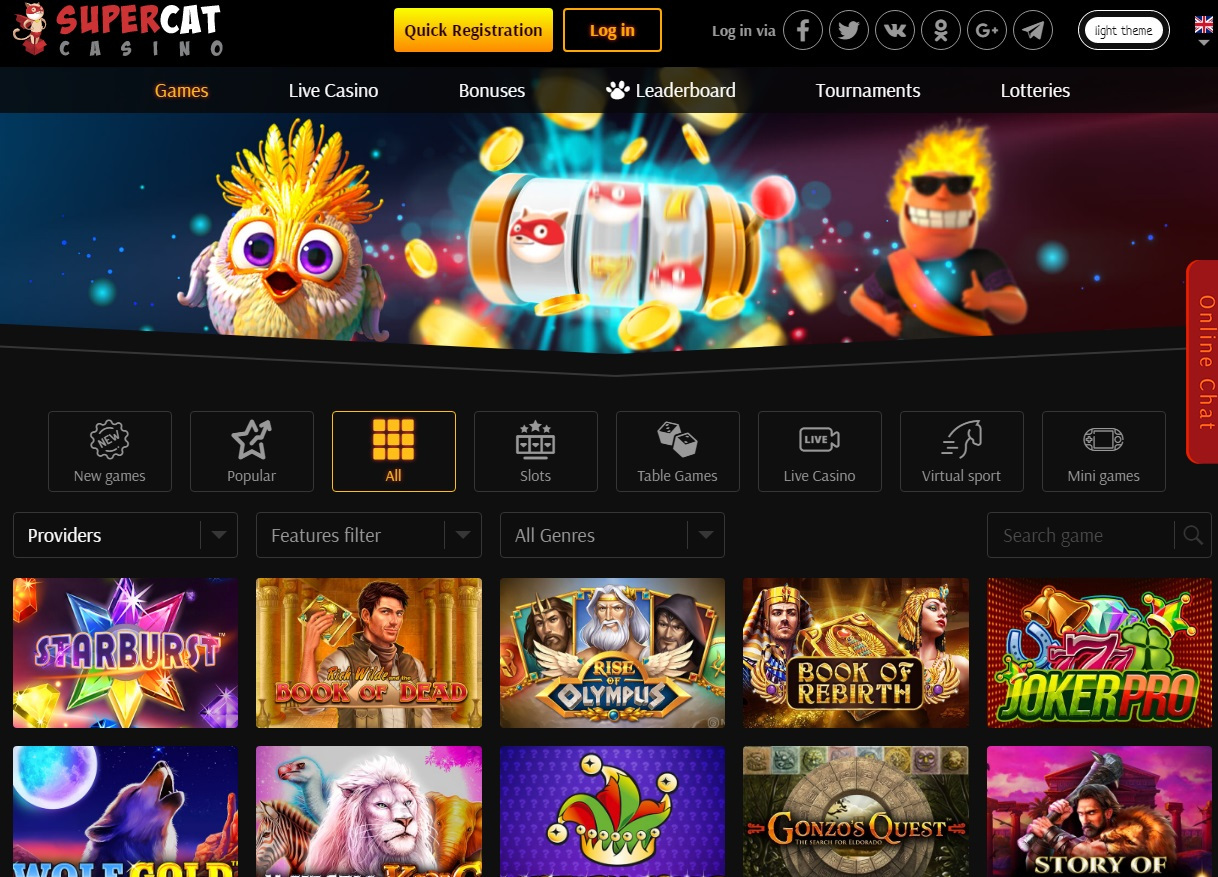 Лицензионное казино 2019 года SuperCat Casino для новых игроков предлагает бездепозитный бонус 60 бесплатных вращений за регистрацию,а за депозит 700 рублей ещё 30 спинов в слоте Book of Dead